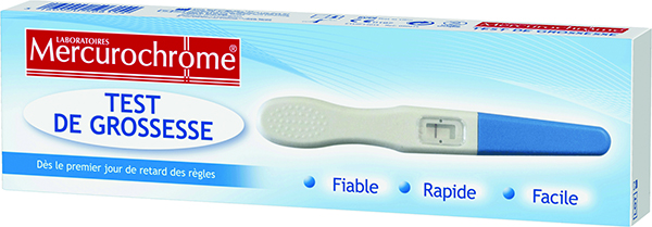 Comment utiliser ce test? : Tout d’abord enlevez le capuchon, ensuite mettez Mercurochrome dans le jet d’urine au moins 5 secondes, refermez et déposez le test sur une surface plane avec la fenêtre vers le haut, enfin, attendez 5 minutes et le résultat apparaîtra. Si vous avez eu deux lignes = test positif sinon une seule ligne = test négatif.